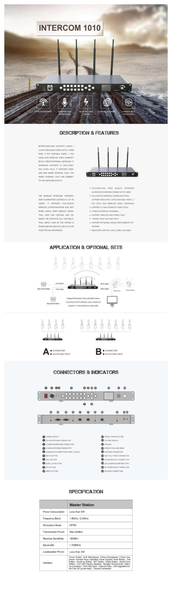 The 1010 Intercom SUPPORTS L9GHZ /2.4GHZ FREQUENCY BAND WITH 1 XED PART, 8 PIECE PORTABLE PARTS, 2 PIECE LOCAL RJ45 WIRELlNE VOICE CONNECTED BY 4 PIECES EXTERNAL ANTENNAS. IT