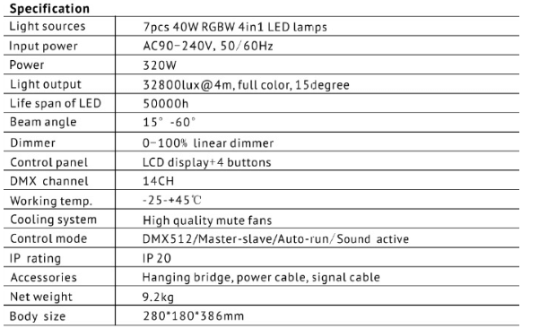 - LED: 7pcs 40W 4in1 RGBW LED Lamps