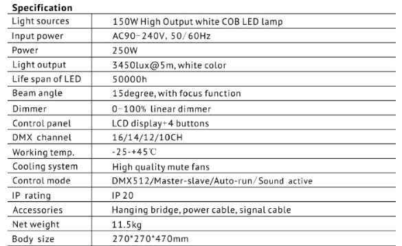 - Control mode: DMX-512; Master/slave mode; Demo mode; Sound active·